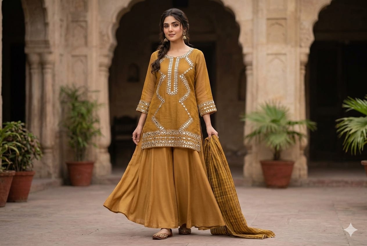 Featuring a soft mauve hue that offers a delicate, design. The short shirt is adorned with intricate **zari machine work* and authentic *sheesha (mirror) embellishments* arranged in Beautiful design across the front and sleeves. It is paired with Organza dupatta and matching Plazo trouser, creating a timeless and regal look for festive occasions.