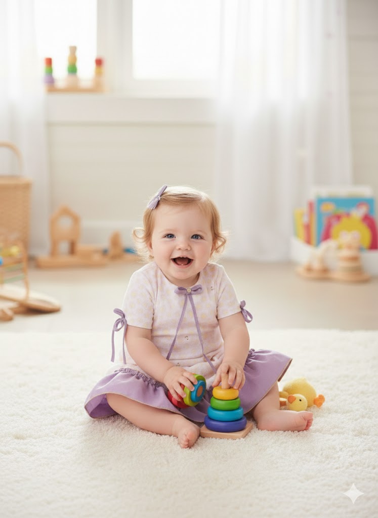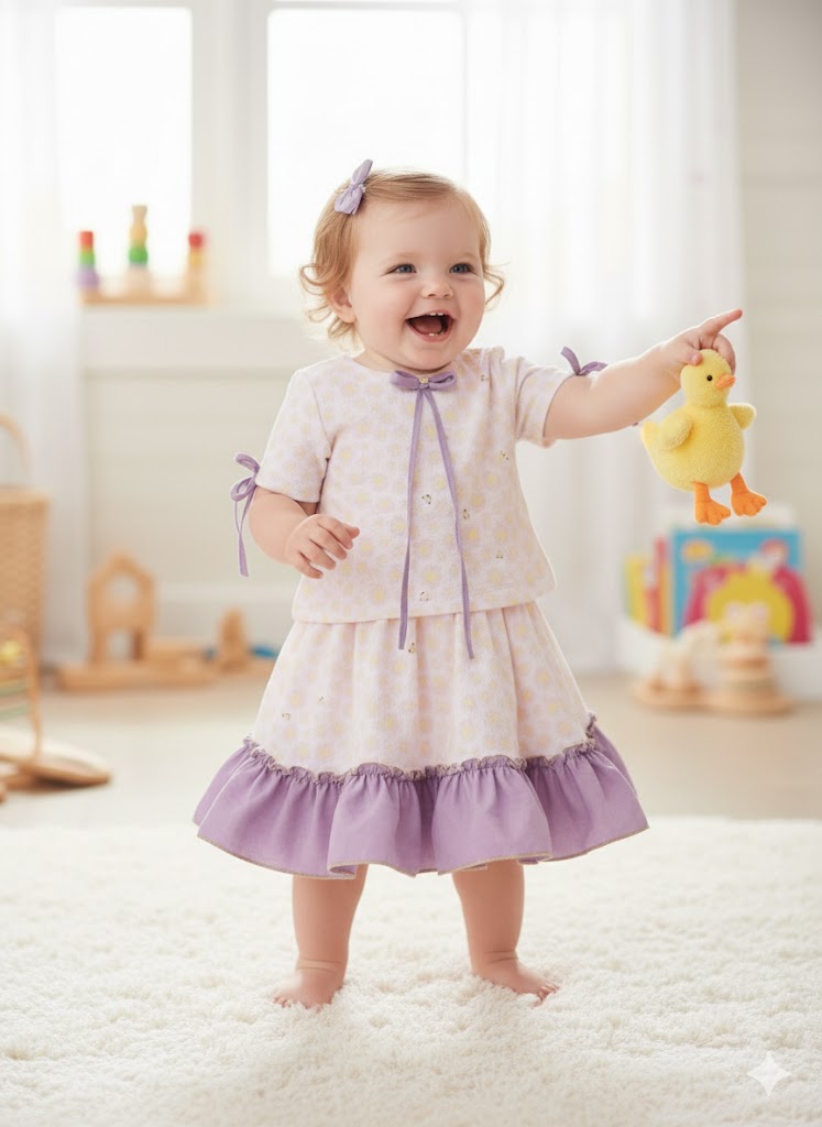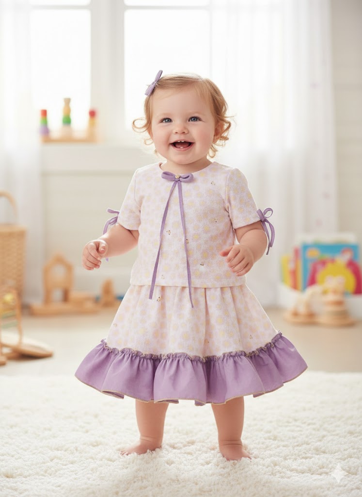 This cute baby outfit features a soft printed shirt with delicate lavender piping and bow details, paired with a matching skirt finished with a frilled hem. Made from lightweight, breathable fabric, it ensures all-day comfort and easy movement. Perfect for playful days and adorable everyday styling.